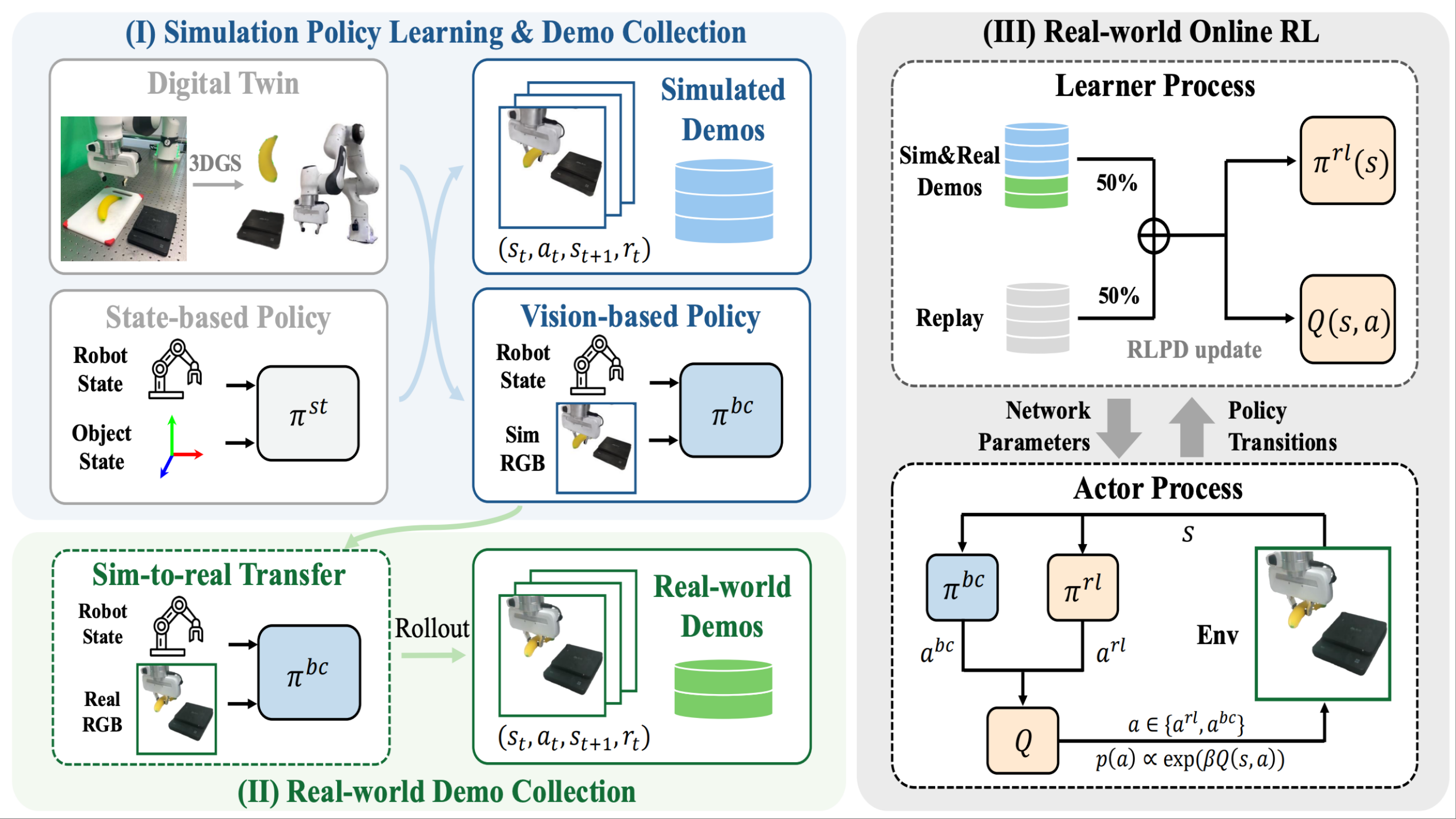 We combine the strengths of real-world RL and real-to-sim-to-real approaches to accelerate policy learning.